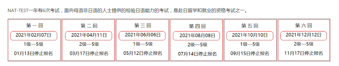日本语NAT-TEST考试每两月一次且在双数月进行,是面向母语不是日语的日语学习者,判定其日语能力的考试。难度共分为5个级别,分别为“4级”、“3级”、“准2级”、“2级”、“1级”。