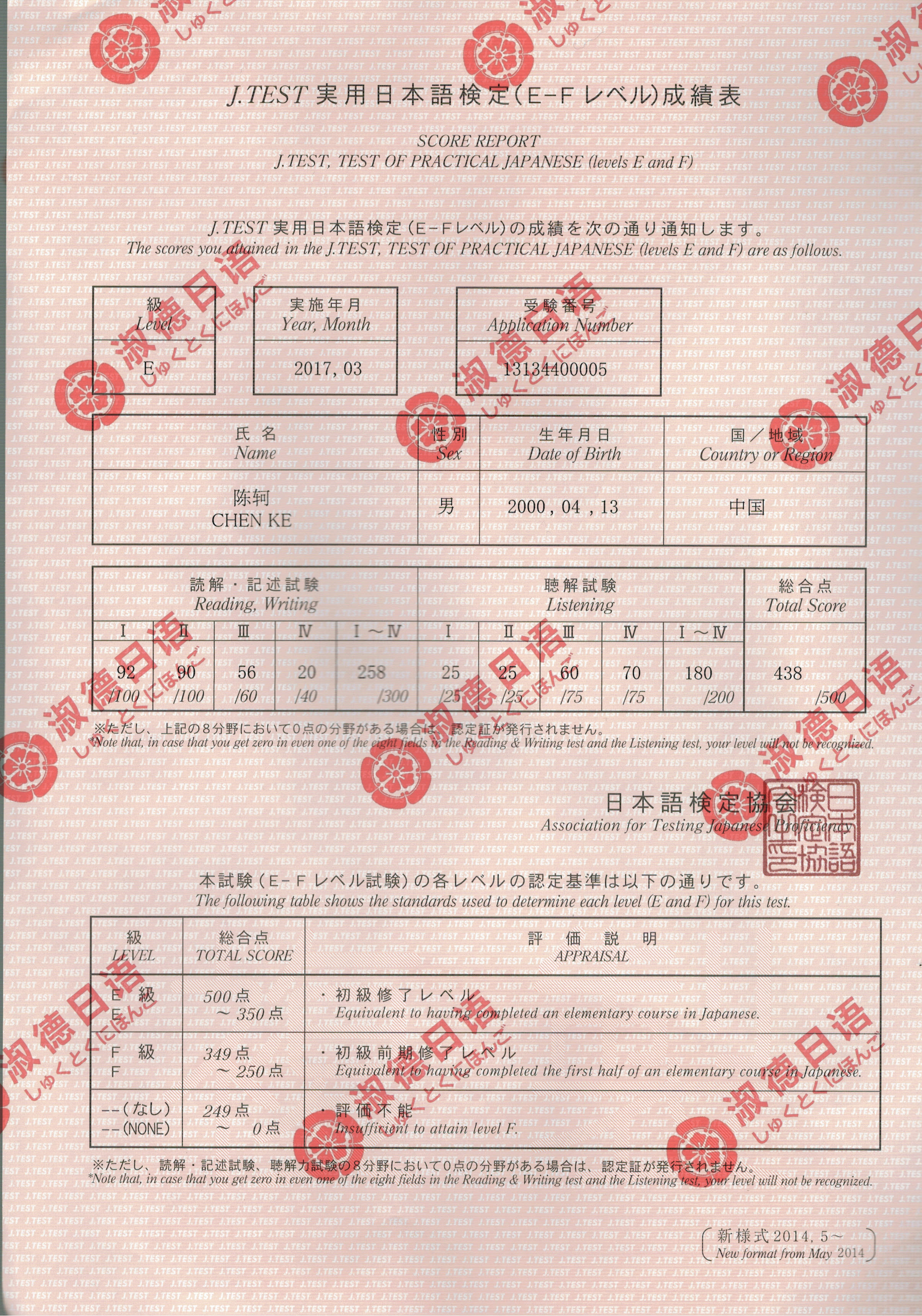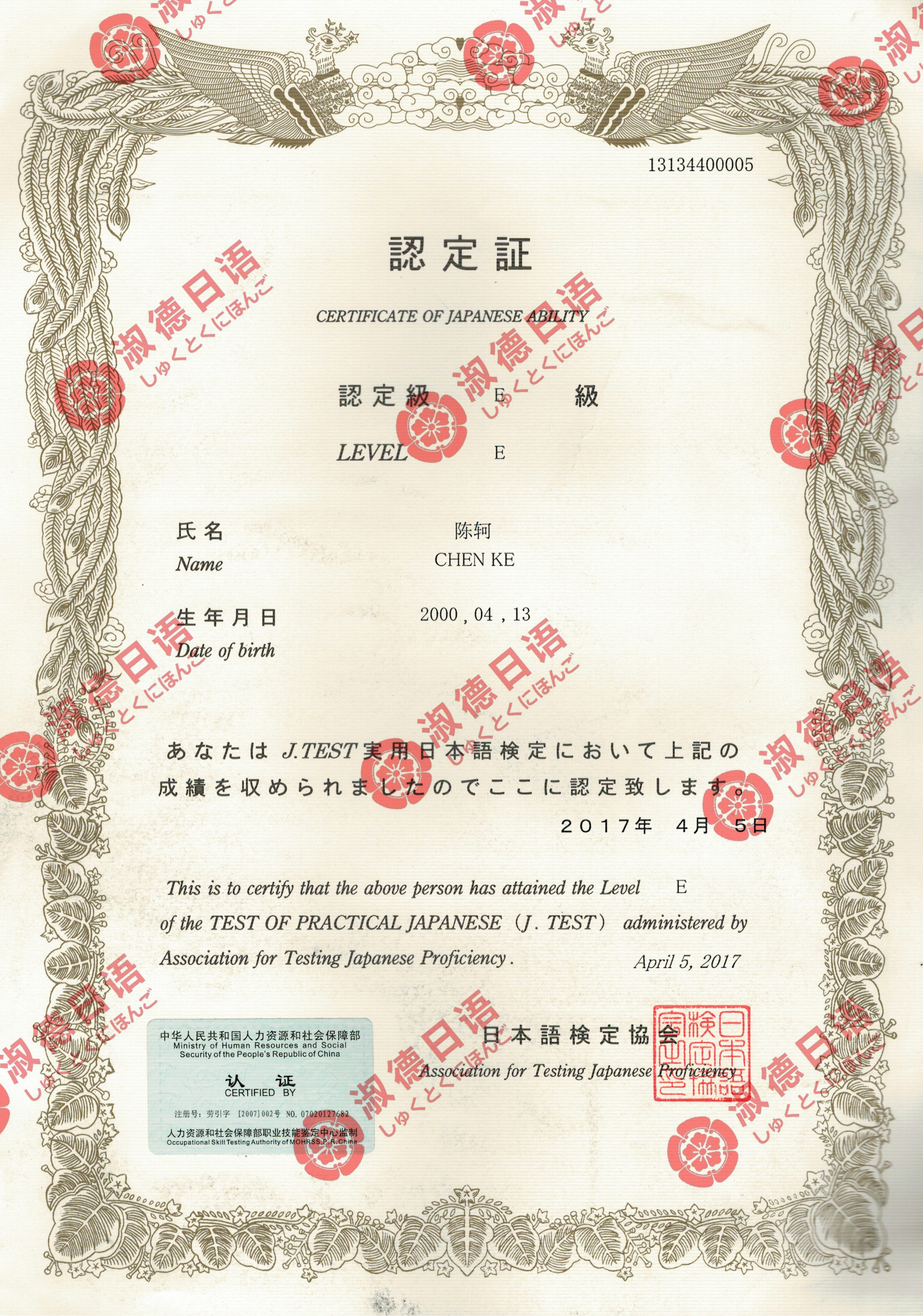 > 淑德日语J.TEST-E级通过学员-陈轲