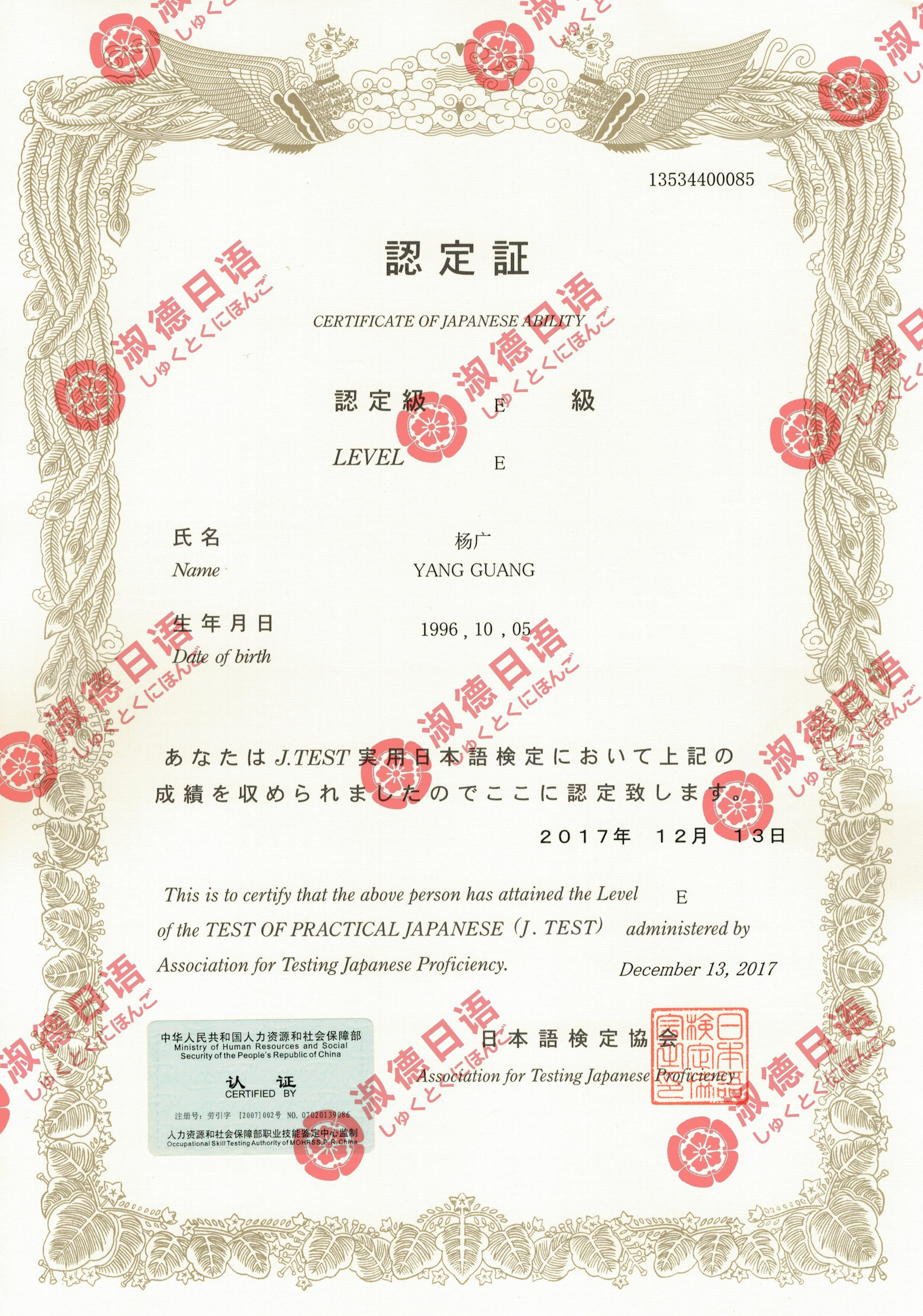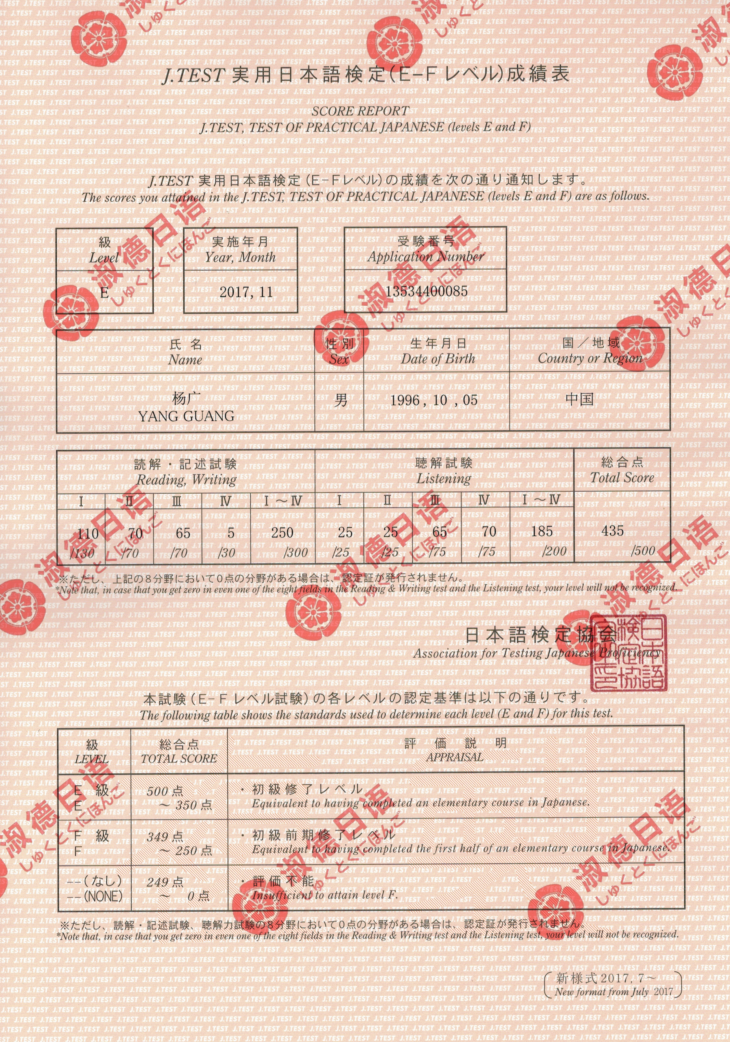 淑德日语J.TEST-E级通过学员-杨广