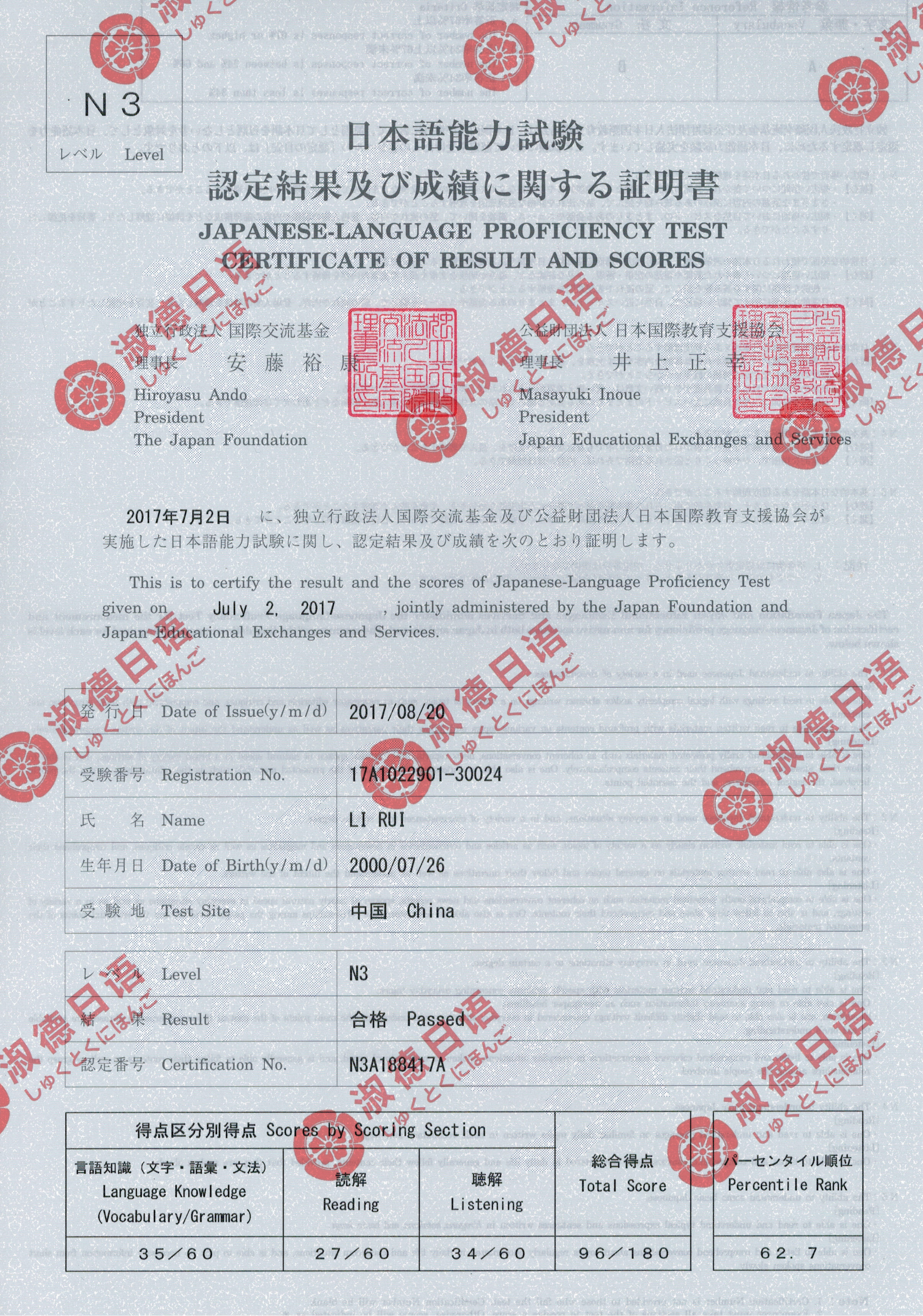 2013年7月胡同学获得N2证书
