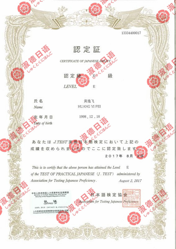淑德日语J.TEST-E级通过学员-周文麟 黄逸飞