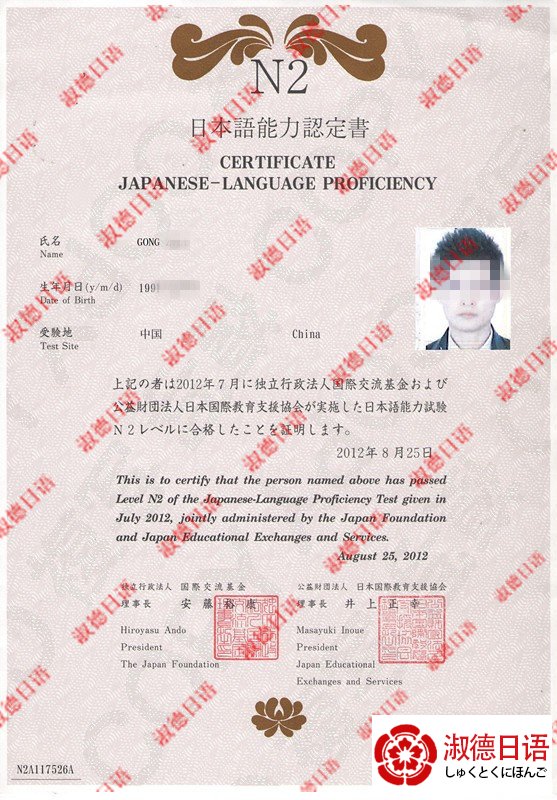 2012年7月龚同学获得N2证书