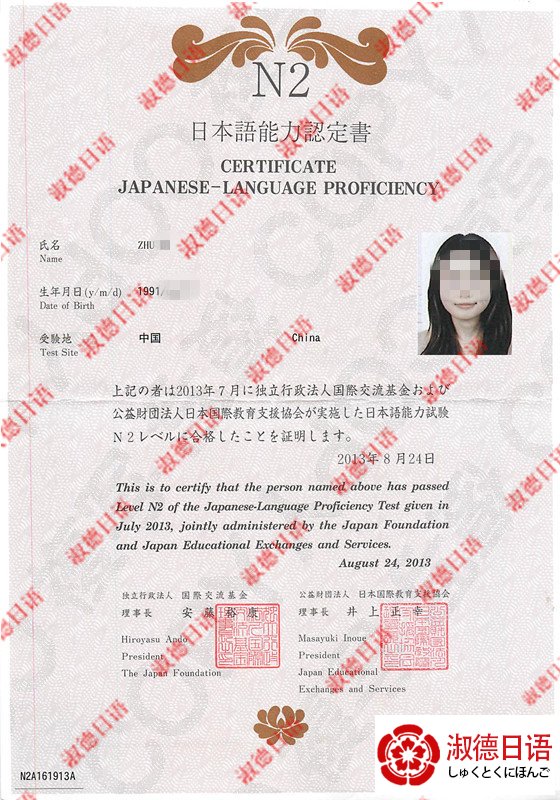 淑德日语朱同学获得N2证书