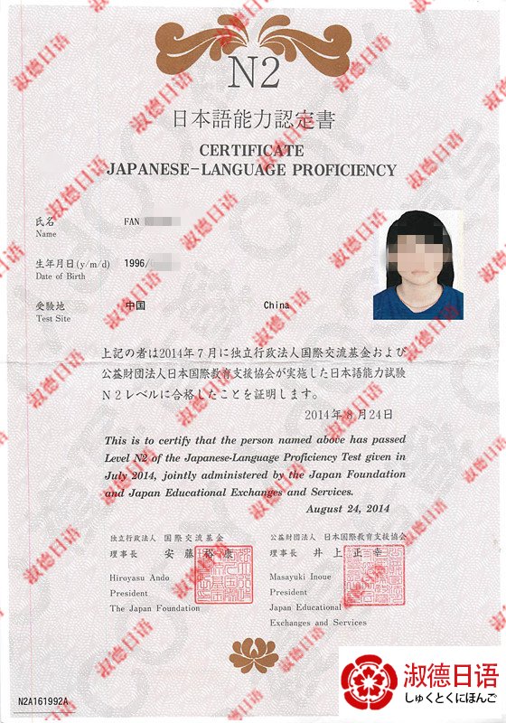 > 2014年7月范同学获得N2证书