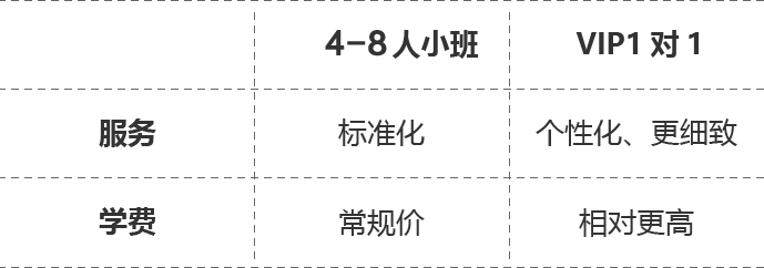 班型分三种:4-6人小班、VIP1对1、假期中班